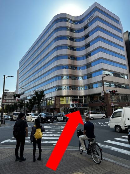 本町一丁目のスクランブル交差点を、写真に映るビル方向へ斜めに渡ります。